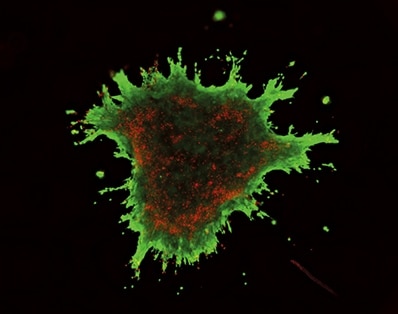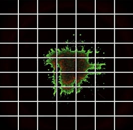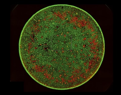 Das Wachstumspotenzial von Zellen, die unter verschiedenen Bedingungen kultiviert wurden, kann durch die Berechnung des Verhältnisses von lebenden Zellen zu toten Zellen ausgewertet werden. In den folgenden Bildern wird die Fluoreszenzmikroskopie verwendet, um beide Zellarten voneinander zu unterscheiden: Die lebenden Zellen sind leuchtend grün und die toten Zellen leuchtend rot. Für eine genaue Quantifizierung muss die Betrachtung bei einer Vergrößerung stattfinden, bei der die Form der einzelnen Zellen klar erfasst werden kann.