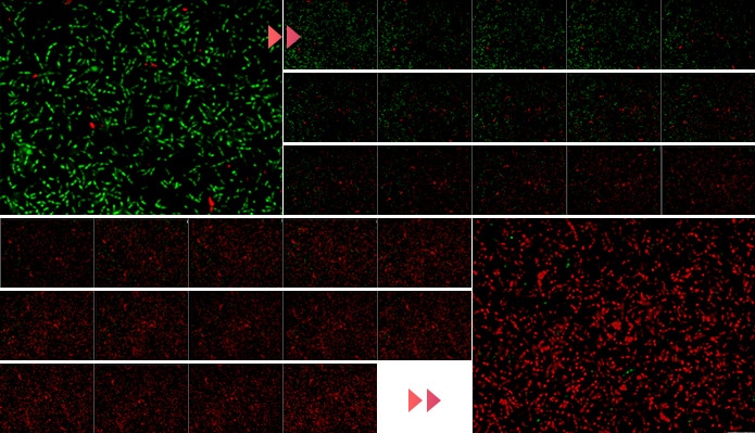 Für die Bewertung von Tensiden und Konservierungsstoffen in kosmetischen und quasi-pharmazeutischen Produkten sowie für Viabilitätsprüfungen, z. B. zur effektiven Zählung von Laktobazillen in Lebensmitteln, kann das BZ-X Zellmembranen mit Licht bestrahlen, um lebende Mikroben zu prüfen und tote Mikroben durch Helligkeitsveränderungen als rot darzustellen. Die Helligkeitsänderungen werden als Live-Zellen-Bildgebung (Zeitrafferbildgebung) dargestellt und aufgezeichnet und können zur Echtzeitbetrachtung und -messung zu jedem beliebigen Zeitpunkt verwendet werden.