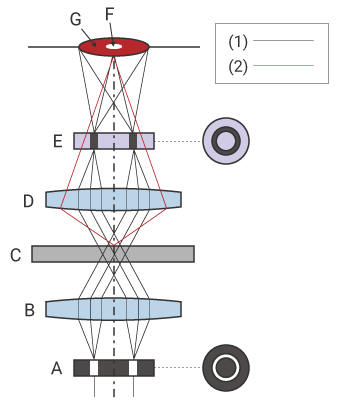 - Mikroskope, die eine Phasenkontrastbetrachtung bieten, haben eine Phasenplatte und einen Ringspalt (Ringblende) im optischen Weg. Dieser Ringspalt formt das Licht der Lichtquelle zu einem Lichtring. Das ringförmige Licht passiert die ringförmige Phasenplatte auf der Objektivseite durch den Kondensor und die Probe. Die Phasenplatte erzeugt eine Phasenverschiebung des Lichts, das durch die Probe läuft.