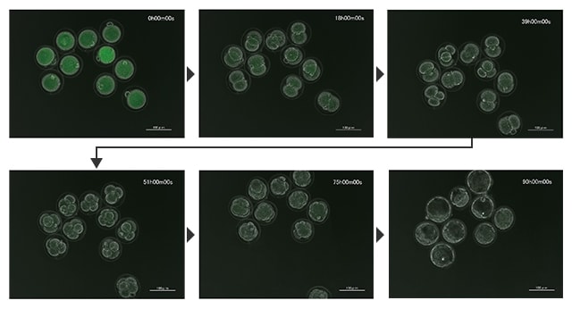 Zellen teilen sich, während sie Leben erhalten, wachsen oder schaffen. Das Erfassen und Betrachten des Prozesses der lebenden Zellteilung in chronologischer Reihenfolge ist für eine Vielzahl von Forschungsarbeiten sehr wichtig. In diesem Abschnitt werden Beispiele für Zeitrafferaufnahmen vorgestellt, die den Prozess der lebenden Zellteilung anhand von Zeitraffervideos und Bildern, die mit einem Fluoreszenzmikroskop aufgenommen wurden, festhalten.