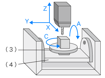Eine 5-Achsen-Werkzeugmaschine hingegen verfügt neben der X-, Y- und Z-Achse zusätzlich über jeweils eine zusätzliche Dreh- und eine Kippachse. Der Tisch, auf dem das Werkstück liegt, dreht sich. Die beiden Dreh- und Kippachsen bestehen aus der A-Achse, die das Werkstück um die X-Achse dreht, und der C-Achse, die das Werkstück um die Z-Achse rotieren lässt. Mit dieser Struktur kann eine 5-Achsen-Werkzeugmaschine alle Oberflächen des Werkstücks auf dem Tisch mit Ausnahme der Unterseite bearbeiten, ohne dass das befestigte Werkstück vom Tisch entfernt werden muss.