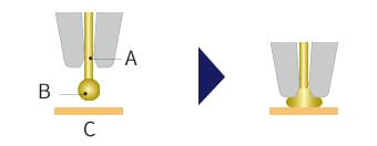 Es werden röhrenförmige Kapillaren (wie eine Injektionsnadel) verwendet, durch die Metalldrähte verlaufen. Die Drahtspitze wird durch Entladung angeschmolzen. Der runde Teil wird dann zur Befestigung an die Elektrode gebondet. Dies wird als Ball Bonding oder erstes Bonding bezeichnet. Der Ball wird unter Druck der Kapillare, Wärme und Ultraschall auf die Kontaktfläche gebondet.