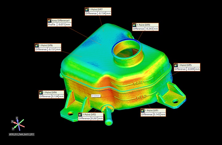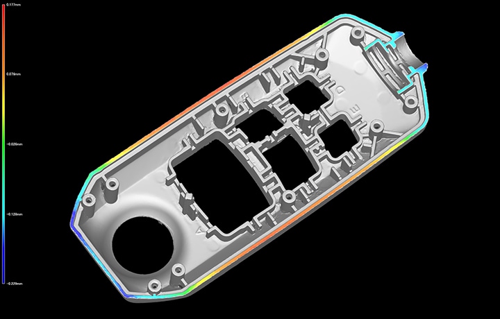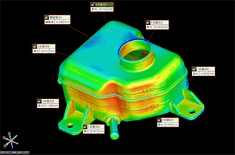 Durch den Vergleich der CAD-Daten eines Produkts mit den erfassten Messdaten können Unterschiede zwischen dem tatsächlichen Produkt und den Sollwerten visualisiert werden. Bei Bauteilen, die mit bisher verwendeten Systemen schwer zu messen waren, können durch den Vergleich der Messergebnisse mit den CAD-Daten unentdeckte Defekte identifiziert werden. Dies ist effektiv für Prüfungen und Ursachenanalysen von Bauteilen mit Passmängeln.