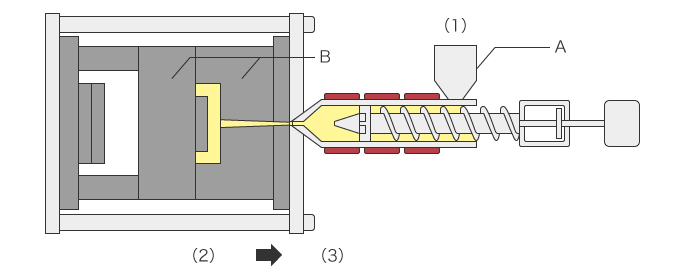 Das Grundprinzip des Spritzgießens ist unten dargestellt.
