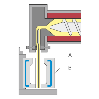 - Bei dieser Methode (auch Verbundguss genannt) wird ein Einsatz, z. B. eine Metallschraube oder eine Anschlussklemme, im Voraus in die Form gelegt und anschließend Kunststoff um den Einsatz herum gespritzt, um ihn zusammen mit dem Einsatz zu formen.