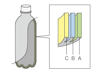Wenn das Produkt mit Flüssigkeit gefüllt werden soll, kann es erforderlich sein, die Art des Kunststoffs entsprechend den Eigenschaften der Flüssigkeit zu wählen. Wenn zum Beispiel die Oxidation durch das Eindringen von Sauerstoff verhindert werden muss, wird ein Kunststoff verwendet, der eine Gasbarriere besitzt. Wenn chemische Beständigkeit erforderlich ist, werden mehrere Formmaterialien, darunter auch Kunststoffe, die sich bei Kontakt mit Chemikalien nicht zersetzen, in Schichten geformt.
