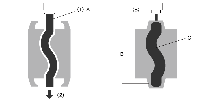 - (2) Die Luft wird vom Ausgang auf der gegenüberliegenden Seite angesaugt. Der Vorformling tritt in die Form ein und bewegt sich entlang der inneren Form, bis er den Boden der Form erreicht.