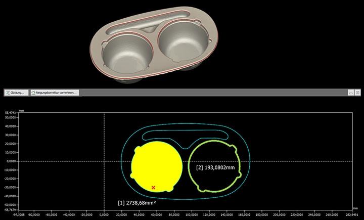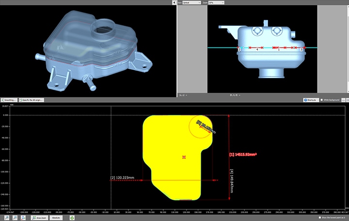 Querschnitte, die mit handelsüblichen Systemen nur schwer zu messen sind, können nun zerstörungsfrei erstellt werden und ermöglichen eine detaillierte Messung und Analyse. Querschnitte können anhand von Basisebenen aus verschiedenen Perspektiven gelegt werden, um vielfältige Messungen zu ermöglichen.
