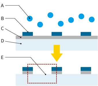 - Schichten, die nicht vom Abdeckmittel bedeckt sind, werden von den Ionen entfernt.