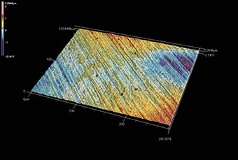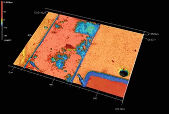 Metallstrukturen, die bisher nur mit einem REM zu sehen waren, können nun betrachtet werden. Die Messung der Höhe der durch Ätzen erodierten Stellen ermöglicht eine präzise Bewertung der Struktur.