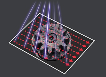 Obwohl das archimedische Prinzip für hochpräzise Volumenmessungen verwendet werden kann, bedeutet das Eintauchen des Messobjekts in eine Flüssigkeit, dass das Messobjekt nass werden muss, weshalb es nicht für alle Messobjekte geeignet ist. Für solche Messobjekte kann stattdessen ein Laser-Volumeter verwendet werden. Laser-Volumeter nutzen einen Laserstrahl zur Erkennung des Abstands zum Messobjekt, um dessen Form abzutasten. Dies ermöglicht eine schnelle, berührungslose Messung des Volumens. Die Messergebnisse sind nicht nur schnell und berührungslos, sondern können auch in 2D und 3D angezeigt werden. Darüber hinaus kann die Form anhand tatsächlicher Messungen quantifiziert werden.