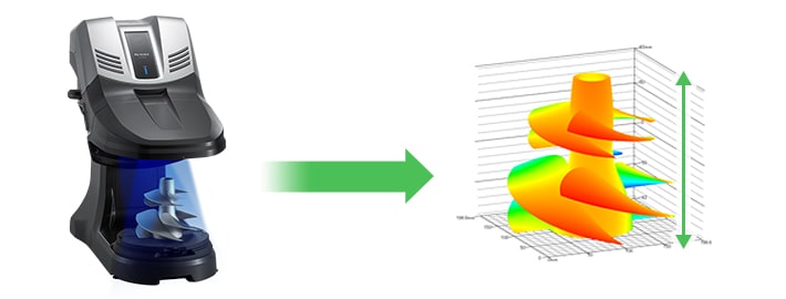 Zudem muss man nicht befürchten, durch die Reichweite des Lasers eingeschränkt zu werden, wie dies bei Laser-Volumetern der Fall ist. Die Modellreihe VL bietet eine 360°-Erfassung, wodurch auch die Rückseite von Objekten gemessen werden kann. Die Messobjekte werden von zwei Lichtquellen beleuchtet und um 360 Grad gedreht, um die Formdaten von Millionen von Punkten sofort zu erfassen. Dies gewährleistet eine genaue Messung auch bei Freiformflächen sowie bei Wanddicken und vertikalen Wandflächen, die mit gängigen Systemen nicht ohne weiteres messbar sind.