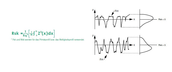 Die Schiefe verwendet die dritte Potenz des Quadratischen Mittenrauwerts,um die Einzelmessstrecke Z(x) als einheitenfreien Wert in dritter Potenz anzuzeigen.