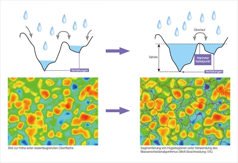 Spitzen und Vertiefungen brauchen lediglich ein wenig höher bzw. tiefer als andere Punkte in ihrer jeweiligen Nachbarschaft zu sein. Deshalb kann eine Oberfläche mit einer feinen Rauheit eine große Anzahl von Spitzen und Vertiefungen aufweisen. Wenn man nun den Wasserscheidenalgorithmus auf eine derartige Oberfläche anwendet, kann sich eine allzu feine Segmentierung in eine Vielzahl winziger Hügel- und Talregionen ergeben.