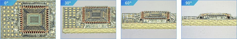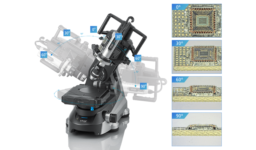 Das Digitalmikroskop VHX ermöglicht die Betrachtung von Objekten aus jedem beliebigen Winkel. Durch das euzentrische Design bleibt das Objekt auch bei geneigtem Objektiv im Sichtfeld.