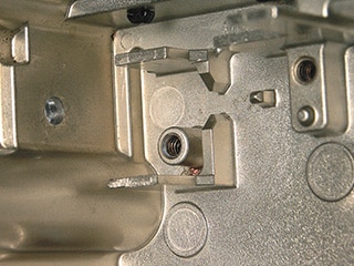 | Risse/Verzug | Ein unzureichender Aushebewinkel, eine ungleichmäßige Schrumpfung oder falsches Auswerfen (Heißrissbildung bei der Erstarrung und Kaltrissbildung bei Abkühlprozessen und im Zeitverlauf) | Neukonstruktion der Form oder Ändern der Auswerfposition |