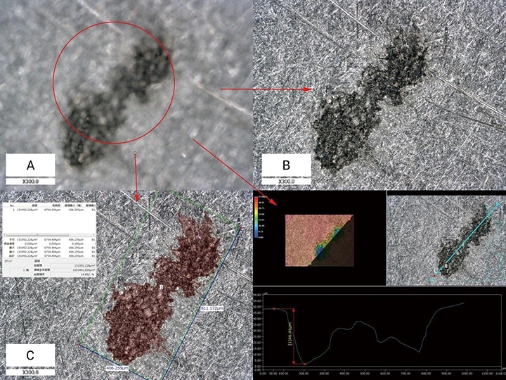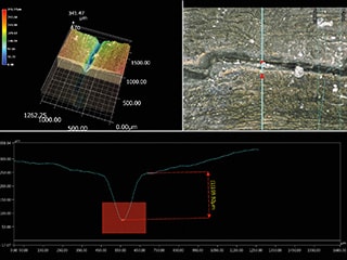 Mit dem Digitalmikroskop der Modellreihe VHX können 3D-Formen und Profile (2D-Querschnittsformen) anhand von Höheninformationen gemessen werden. Selbst auf einer unebenen Druckgussoberfläche lassen sich dank der 3D-Darstellung mit vollständiger Fokussierung des Objekts, Gusslöcher, Lunker und alle anderen derartigen geringfügigen Veränderungen der Oberflächenform erkennen.
