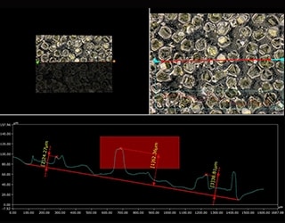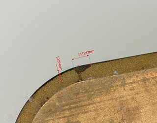 Mithilfe der 3D-Zusammensetzungsfunktion des Digitalmikroskops der Modellreihe VHX können Profilmessungen durchgeführt werden. Mit dieser Funktion lässt sich die Oberflächenform eines PKD-Werkzeugs nachvollziehen und es lassen sich nicht nur Absplitterungen, sondern auch der Verschleiß in Mikrometereinheiten messen.