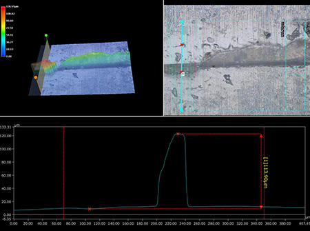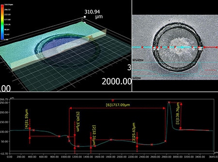 Mit dem Digitalmikroskop der Modellreihe VHX können neben der Betrachtung mit hochauflösenden Aufnahmen auch präzise 3D-Formen im Submikrometerbereich und Profile von fehlerhaften Teilen gemessen werden.