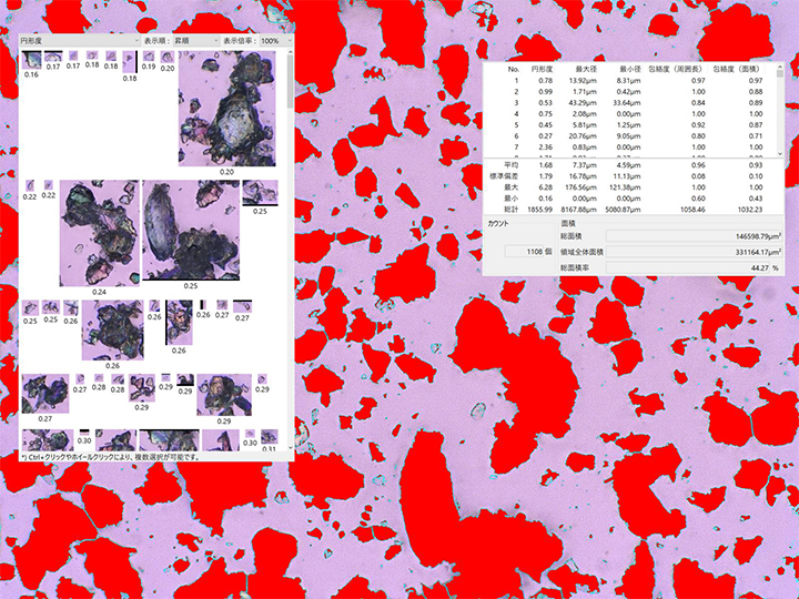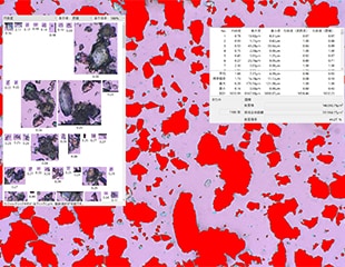 Die automatische Flächenmessung/Zählung kann für eine nahtlose automatische Messung und Analyse der Partikel in dem im aufgenommenen Bild ausgewählten Bereich verwendet werden. Diese Funktion zählt nicht nur genau die Anzahl der Partikel, sondern misst und berechnet auch automatisch detaillierte Werte, wie z. B. Rundheit, maximaler Durchmesser, minimaler Durchmesser, Konvexität und Festigkeit sowie deren Durchschnitt, Standardabweichung, Maximalwert, Minimalwert und Summe und zeigt diese Werte in einer Liste an.