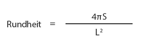 Unter der Annahme, dass S die projizierte Fläche und L der Umfang ist, wird dieser Parameter mit der folgenden Formel berechnet. Eine Rundheit von 1 bedeutet eine perfekte Kugel. Je komplexer die Form ist, desto geringer wird die Rundheit (kleiner als 1).