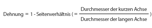 Unter der Annahme, dass a der Durchmesser der kurzen Achse des Partikels und b der Durchmesser der langen Achse ist, kann dieses Verhältnis (a/b) bestimmt werden. Die Dehnung, die die Länge und Schmalheit des Partikels anzeigt, ist 0, wenn das Seitenverhältnis 1 ist, wie zum Beispiel bei Kreisen und Quadraten. Die Dehnung wird mit der folgenden Formel berechnet.