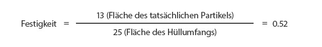 Dieses einfache Diagramm zeigt ein Beispiel für die Ermittlung der Festigkeit durch eine Binarisierung nach Pixeln. Der folgende Wert kann berechnet werden, indem 13 Pixel im Bild als Fläche des eigentlichen Partikels und 25 Pixel im Bild als Fläche des Hüllumfangs definiert werden.