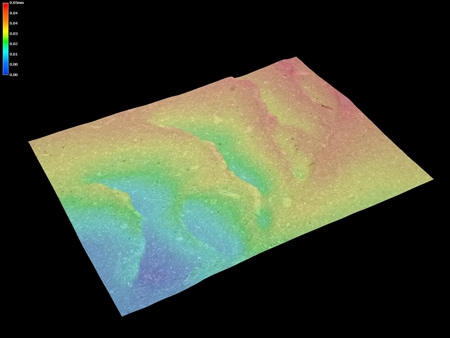 Die 3D-Bildgebung ermöglicht es, Unregelmäßigkeiten auf der Oberfläche des weißen Gummis sichtbar zu machen.