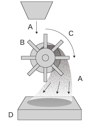 Ein Motor versetzt das Laufrad in Rotation und verteilt das Medium durch die Zentrifugalkraft. Da kein Kompressor erforderlich ist, hat diese Methode einen geringeren Energie- und Kostenbedarf. Allerdings ist die Bearbeitungskraft nicht leicht einzustellen, was eine hochpräzise Bearbeitung erschwert.