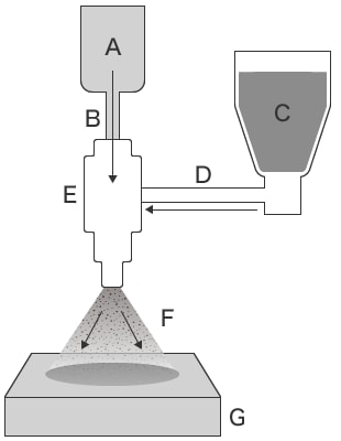 E: Düse, F: Druckluft + Medium, G: Objekt