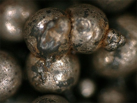 Das Kugelstrahlen ist eine Bearbeitungsmethode, bei der Strahlmittel (kleine Sandstücke oder kleine Stahl- oder Gusseisenkugeln) mit hoher Geschwindigkeit auf ein Objekt gespritzt werden. Diese tragen die Oberfläche des Objekts ab, indem sie kleine Erhebungen und Vertiefungen darauf erzeugen. Polieren führt zu einer glatten Oberfläche, Kugelstrahlen hingegen zu einer rauen Oberfläche. Dieser Abschnitt gibt einen Überblick über das Kugelstrahlen und stellt Beispiele für dessen Betrachtung und Messung mit einem Digitalmikroskop vor.