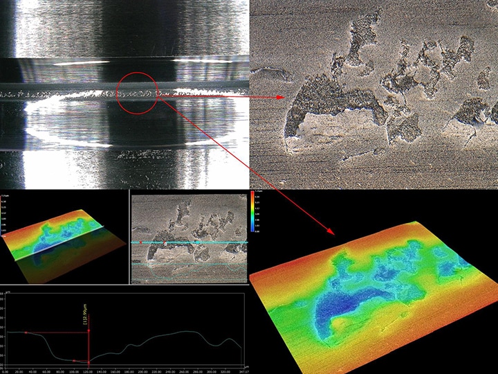 Mit dem Digitalmikroskop der Modellreihe VHX sind nicht nur eine klare Vergrößerung und Betrachtung möglich, sondern auch Messungen und Quantifizierungen. Eine ganze Reihe von Aufgaben – von der Betrachtung von Abblätterungen*, Lochfraß* und anderen Schäden an den aufeinander einwirkenden Oberflächen bis hin zu den für die Rauheitsprüfung nützlichen 2D-Messungen und Rauheitsmessungen – können einfach per Mausklick mit nur einem System ausgeführt werden.