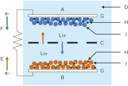 Jeder Teil einer Lithium-Ionen-Batterie, einschließlich ihrer Funktionen, wird hier mit einer Abbildung erklärt, die ein typisches Beispiel für den grundlegenden Aufbau dieser Batterien zeigt.