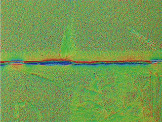 Diesem Bild im optischen Schatteneffekt-Modus können Farbinformationen überlagert werden, um die Informationen über die Oberflächenunregelmäßigkeiten auf leicht verständliche Weise zu visualisieren, indem die Informationen über die Oberflächenunregelmäßigkeiten und die Farbinformationen gleichzeitig dargestellt werden und indem die Informationen über die Oberflächenunregelmäßigkeiten mit verschiedenen Farben angezeigt werden (Farbzuordnung).