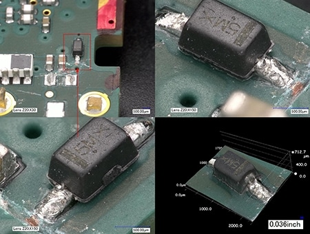 Dank des Digitalmikroskops der Modellreihe VHX, das 2D- und 3D-Messungen sowie Betrachtungen und Analysen mit klaren Aufnahmen mit nur einem System ermöglicht, ändern sich Genauigkeit und Arbeitseffizienz bei der Schadens- und Fehleranalyse von Leiterplatten erheblich, unabhängig von deren dreidimensionalen Strukturen.