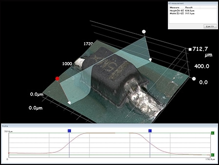 Darüber hinaus ermöglicht die Modellreihe VHX 3D-Form- und Profilmessungen von Fremdkörpern mithilfe der Höheninformationen aus der 3D-Bildgebung. Mit nur einem System lassen sich alle Aufgaben von der quantitativen Beurteilung der Größe, Struktur und des Volumens eines Fremdpartikels bis hin zur Berichterstellung anhand von aufgenommenen Bildern und Messwerten schnell erledigen.