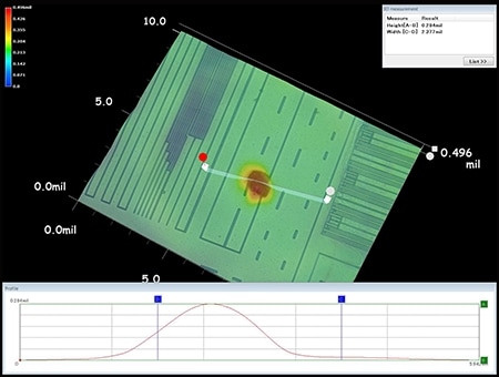 Darüber hinaus können 3D-Form- und Profilmessungen im Submikrometerbereich direkt auf einem hochauflösenden Bild mithilfe der Höheninformationen durchgeführt werden, sodass der Anwender eine quantitative Analyse und Auswertung mit nur einem System vornehmen kann.