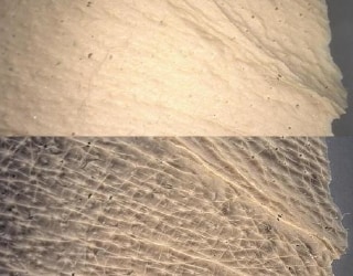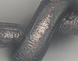 Mit dem Digitalmikroskop der Modellreihe VHX kann der optische Schatteneffekt-Modus verwendet werden. Durch die Beleuchtungsvariation lassen sich mithilfe der entstandenen Kontrastunterschiede kleinste Unregelmäßigkeiten auf der Oberfläche, wie z. B. der Haarkutikula, erkennen. Die Echtfarbeninformationen werden über der Aufnahme im optischen Schatteneffekt-Modus eingeblendet, um die gleichzeitige Darstellung ungleichmäßiger Oberflächen- und Echtfarbeninformationen zu ermöglichen. Die Darstellung einer unebenen Oberfläche mit Höhenfarben erleichtert die Auswertung durch den Anwender.
