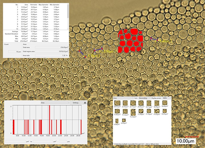 Im ausgewählten Bereich können nicht benötigte Messobjekte ausgeschlossen, überlappende Messobjekte getrennt und Messobjekte mit beliebigen Schwellenwerten binarisiert werden, was eine präzise Analyse und quantitative Auswertung auf einfache Weise ermöglicht.