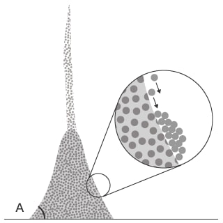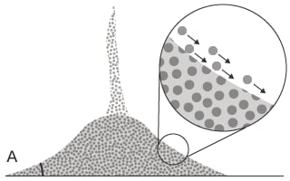 Pulver mit einer hohen Fließfähigkeit bestehen meist aus großen Partikeln, wie z. B. Sand. Diese Pulver verteilen sich auf der horizontalen Ebene und sacken zusammen, wenn sie kegelförmig gehäuft werden.