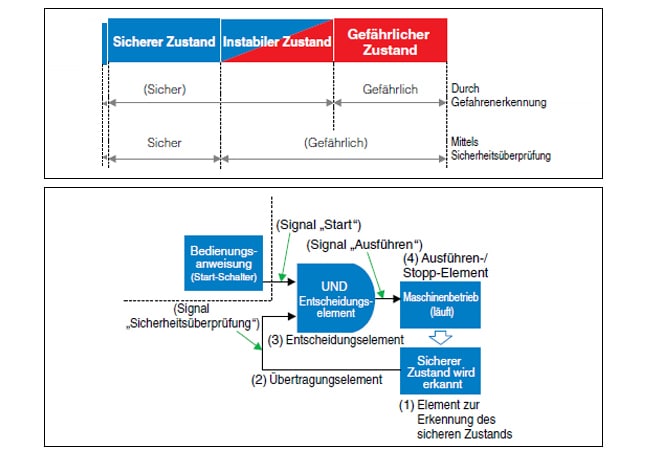 - Diese Systeme lassen einen Betrieb der Anlagen nur zu, nachdem die Sicherheit bestätigt wurde. Auf diese Weise lässt sich ein definitiv sicheres System konstruieren. Im Einzelnen bedeutet dies, dass die Inbetriebnahme und der Betrieb von Anlagen von diesen Systemen nur zugelassen wird, wenn sich keine Personen im Arbeitsbereich der Maschine befindet.