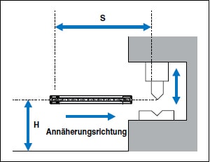 Sicherheitsabstand (S) = Annäherungsgeschwindigkeit des Körpers × Ansprechzeit + Zusatzabstand(abhängig vom Detektionsvermögen des Lichtvorhangs)