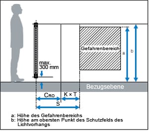 Können Personen nicht daran gehindert werden, oberhalb des Schutzfelds in die Gefahrenzone zu gelangen, muss diese Problematik bei Auslegung der Höhe des Lichtvorhangs und des Mindestabstands S berücksichtigt werden. Dabei ist der Wert für S, der wie unten gezeigt berechnet wird, mit dem Wert unter „Annäherung im rechten Winkel: Modellreihe GL-R“ zu vergleichen