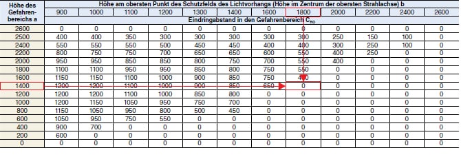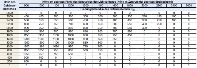 CRO wird wie in der folgenden Tabelle dargestellt anhand der Werte a (Höhe des Gefahrenbereichs) und b (Höhe am obersten Punkt des Schutzfelds des Lichtvorhangs) ermittelt.