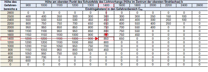 a (Höhe des Gefahrenbereichs) = 1400 mm