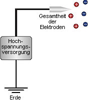 Antistatikgeräte, die mit dem Anlegen von Spannung und mit Koronaentladung arbeiten, weisen folgende Bauweise auf: Nadelförmige Elektroden, an die eine hohe Spannung angelegt wird, ferner eine Hochspannungsquelle sowie Erdungselektroden. Durch das Anlegen von Hochspannung an die Elektroden kommt es an den Nadelspitzen zu einer Koronaentladung.