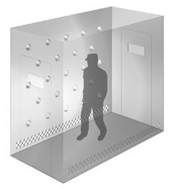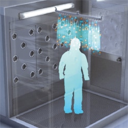 Eine Luftschleuse ist eine Vorkammer zum Entfernen von Staub oder anderen Partikeln, die vor dem Betreten eines Raumes an der Oberfläche von Gegenständen oder Personen haften. Dies geschieht durch den Einsatz von Luftdüsen, wobei die austretende Luft mit HEPA-Filtern gereinigt wird. Wenn Kleidung oder Staub noch mit statischer Elektrizität aufgeladen sind, haftet der von der Luft abgeblasene Staub erneut an.