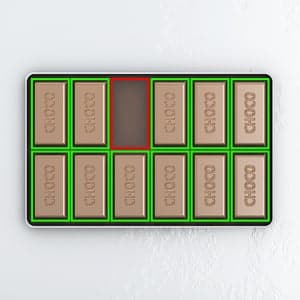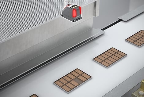 - Mit Hilfe von Vision-Sensoren wird festgestellt, ob die richtige Anzahl von Schokoladenstücken mit der richtigen Ausrichtung eingesetzt wurde, um somit Fehler zu vermeiden.