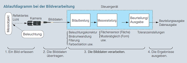 in den Bilddaten erfassen/messen - Die Bilddaten verarbeiten und die Ergebnisse ausgeben oder an angeschlossene Systeme (Computer, SPS usw.) übertragen.