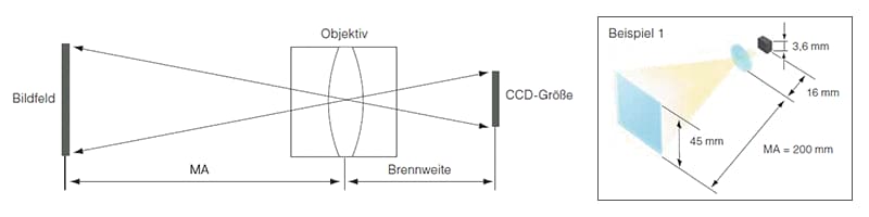 Beispiel 1: Wenn die Brennweite 16 mm beträgt und die CCD-Größe 3,6 mm, dann sollte der Messabstand 200 mm betragen, um ein Bildfeld von 45 mm zu erzielen.